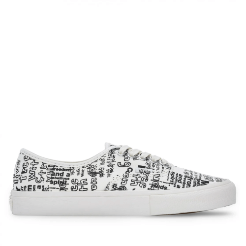 The crisp white canvas upper creates a versatile foundation, making these sneakers easy to pair with any wardrobe. Whether you’re styling them with casual jeans, smart trousers, or street-ready fits, the bold black message accents bring a statement-making edge. True to Vans’ Authentic legacy, the shoe retains its classic low-top silhouette with sturdy canvas fabric and durable rubber waffle outsoles for superior grip.